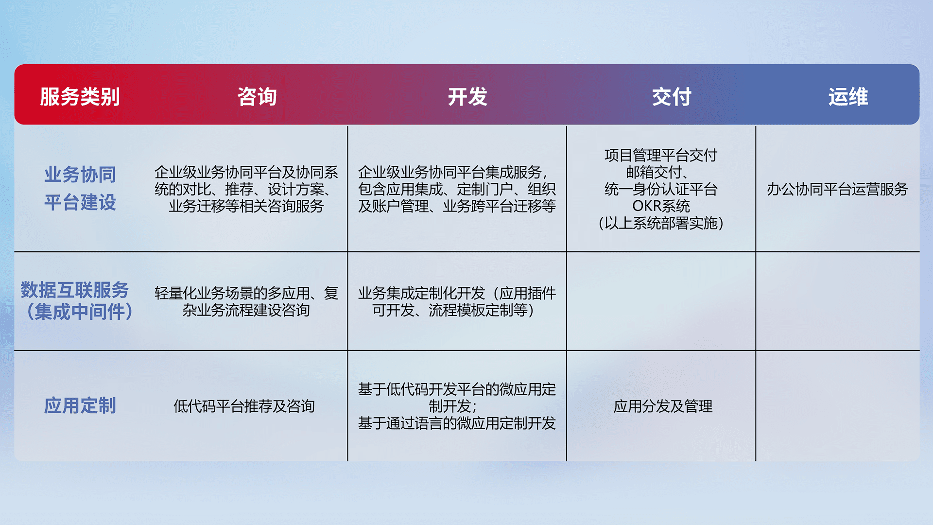 针对钉钉、、企微、、IDaas等平台级产品提供产品的规划、、、方案、、、交付、、、、定制化开发等服务,,,,实现如统一协同办公、、智能客户服务、、、混合会议管理、、智能数据查询、、、等业务场景,,,实现数字化转型。。。。